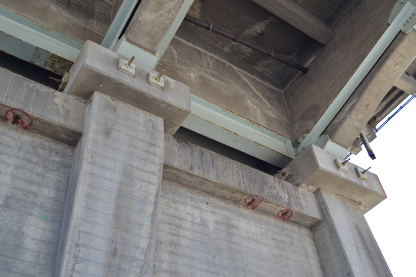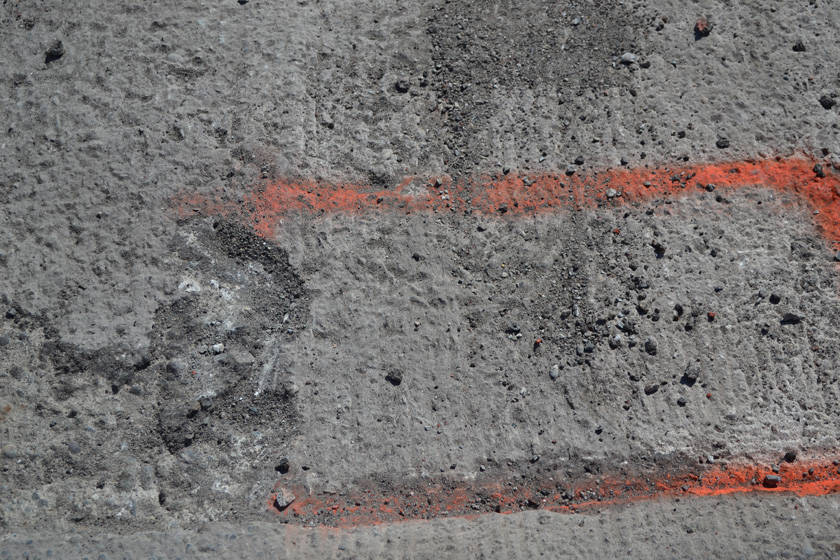 What’s interesting to note is how the delaminated areas are identified. As a standard test, a 10 feet long chain is dragged across the bridge. The sound created from the chain and concrete hitting determines the areas of delamination. High pitch tones means the area is delaminated and low pitch tones means the deck is still solid and intact. After identifying the delaminated areas, workers then mark the areas in red (explains the multiple red rectangles), break the concrete, clean the rebar and loose concrete, pour grout and repave the area.