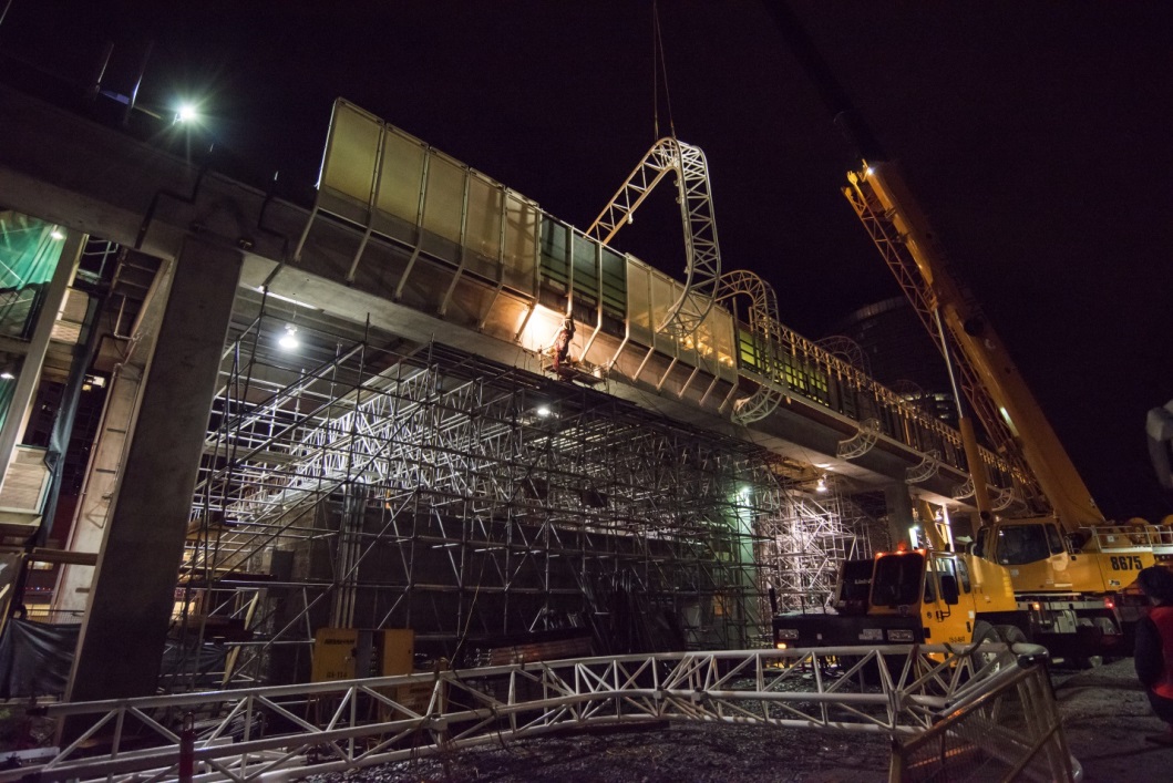 This was necessary to ensure crews could safely install the elevator shafts and hoop trusses over the tracks without trains running below.