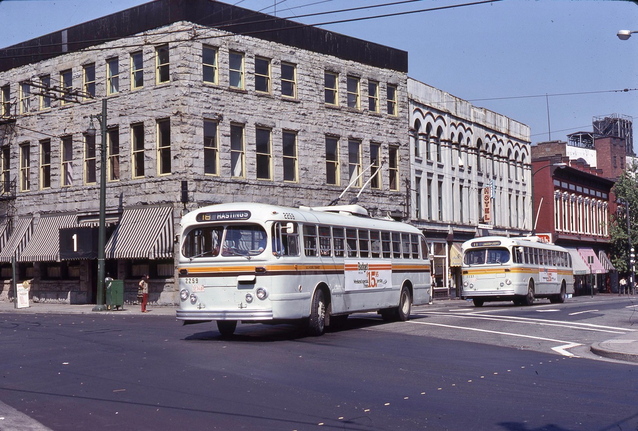 The first trolley bus route was the Fraser-Cambie, going along Fraser from Marine Drive to Kingsway, then down Main to Pender in Chinatown, left on Pender to Seymour, then to Robson and Cambie and over the Cambie Bridge to 29th Avenue.
