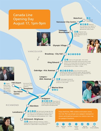 The Canada Line Passport was a souvenir for Metro Vancouver residents who’ve participated in the Opening Day celebrations. People had to collect stamps from eleven of the stations through out the SkyTrain line for a chance to win some outstanding prizes like gift cards to shopping outlets located near these stations. There were live opening ceremonies at Broadway-City Hall, Bridgeport and Richmond-Brighouse stations too, with a free-fare for everyone to ride the Canada Line from 1:00 p.m. to 9:00 p.m.