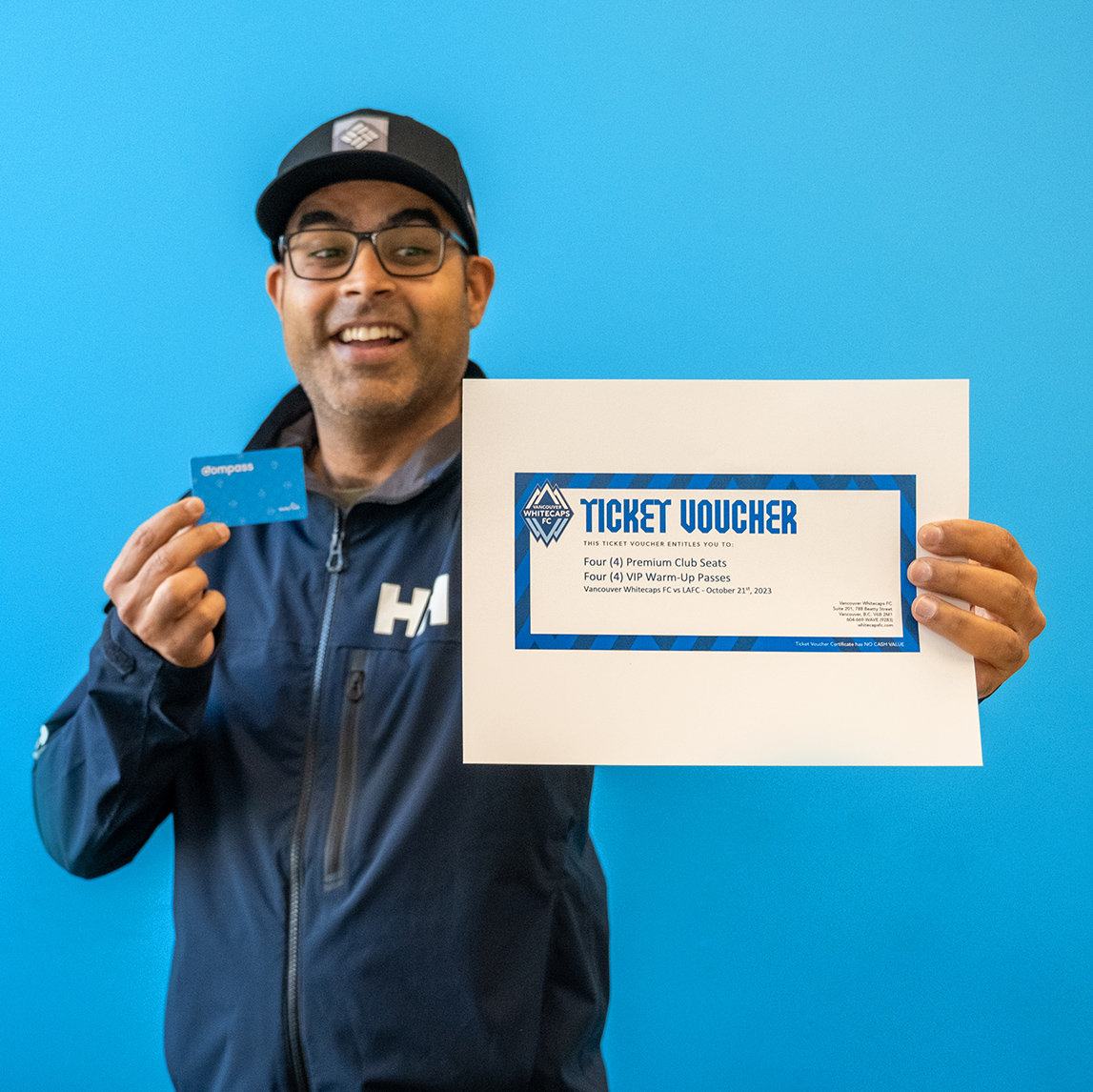 Register your Compass Card at translink.ca/tapintowin, then take transit! Every tap in and complete transit trip earns you an entry. Limited to two entries per day.