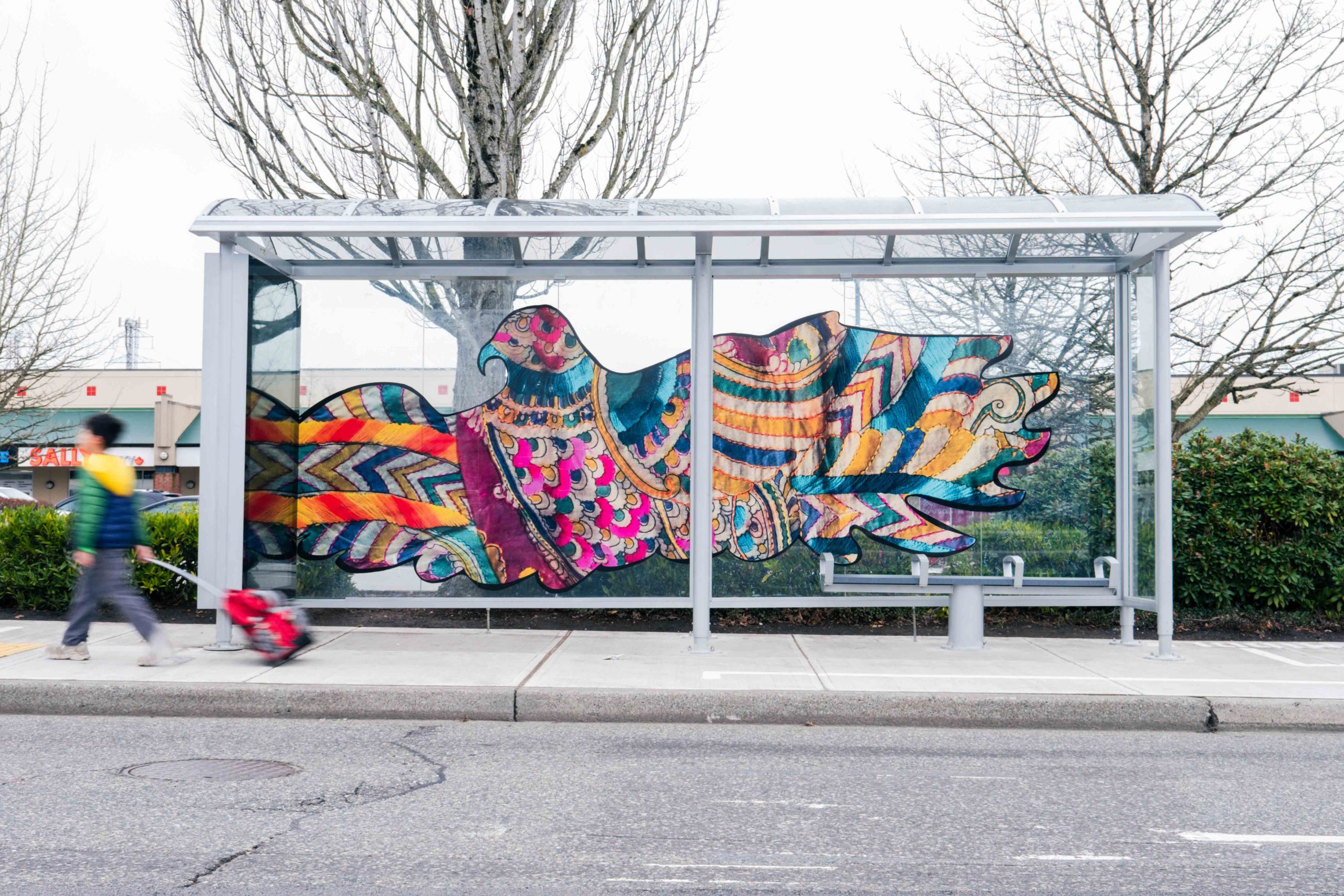 Jessie Sohpaul designed the bus shelter glazing for two bus stops — at the southbound median bus stop at 72 Avenue and Scott Road and the westbound KPU bus stop.