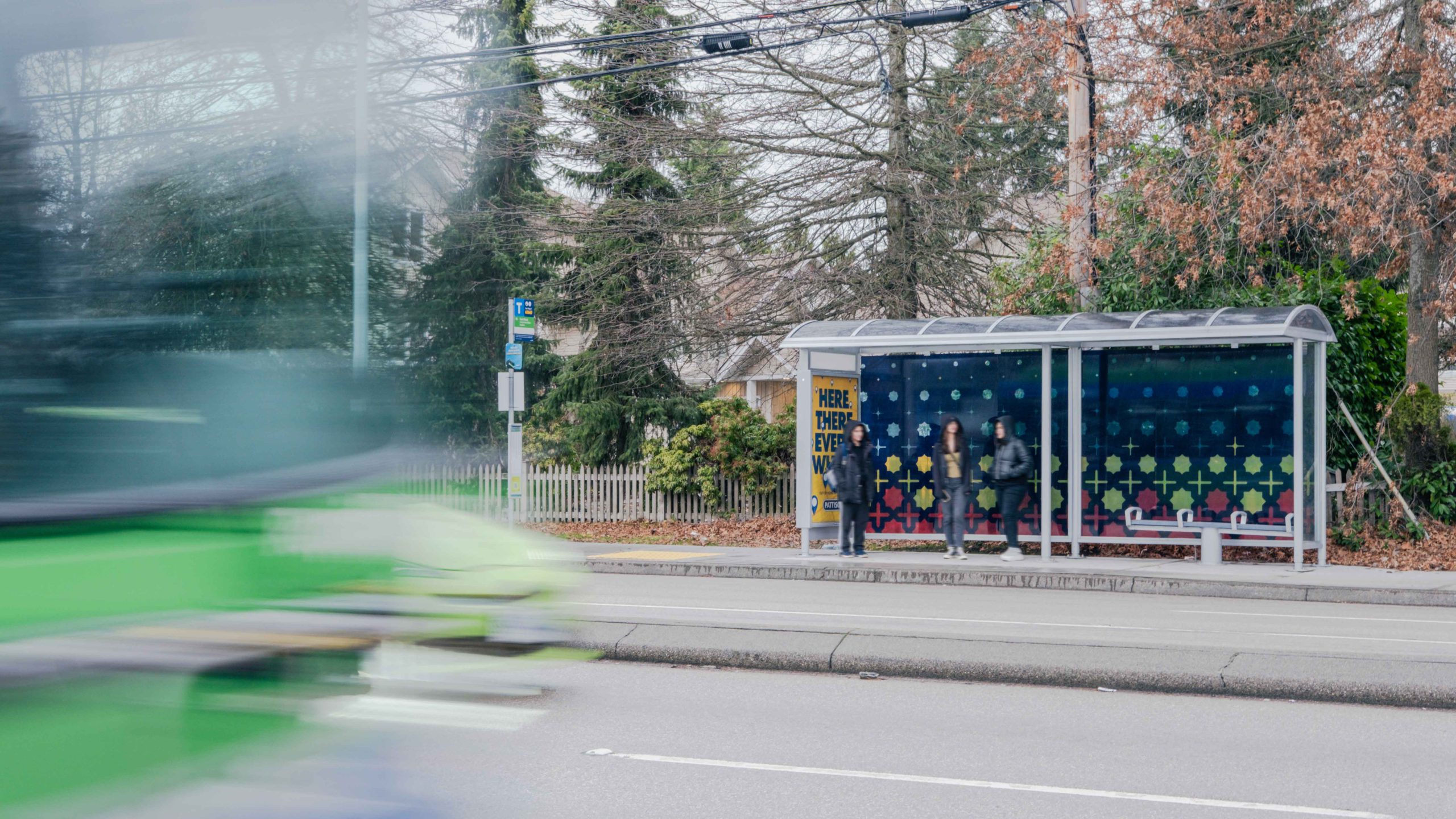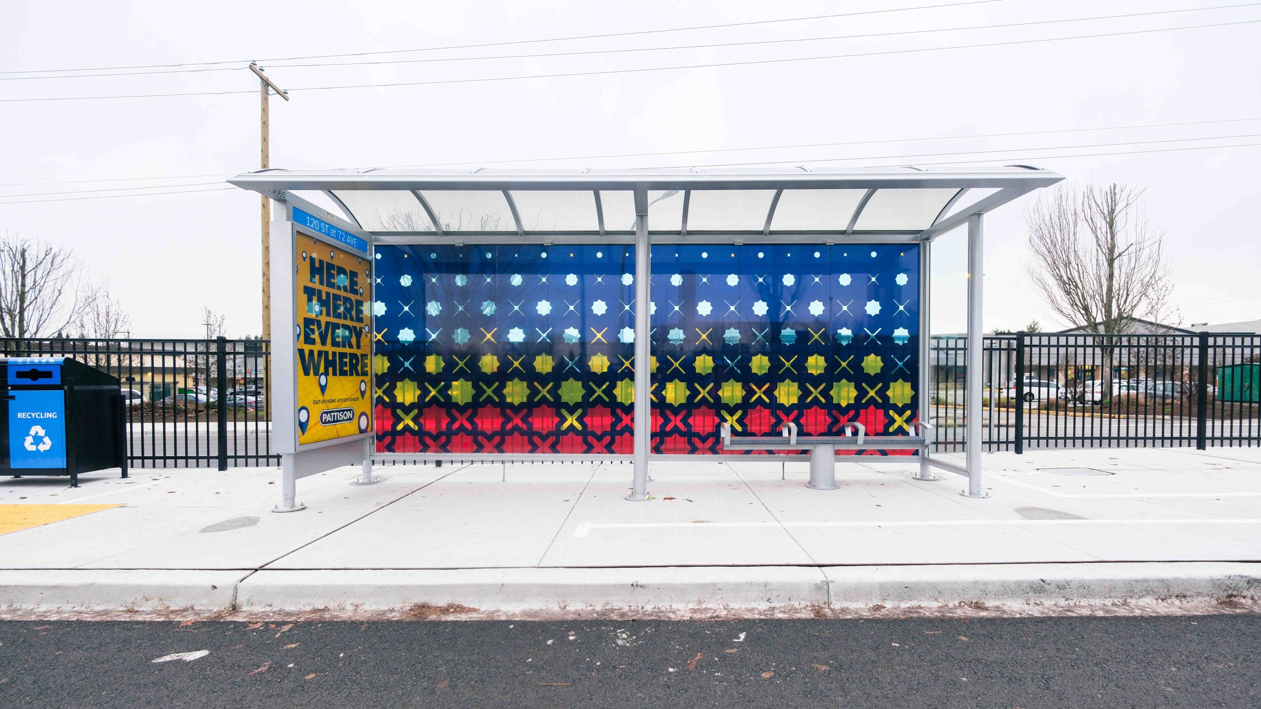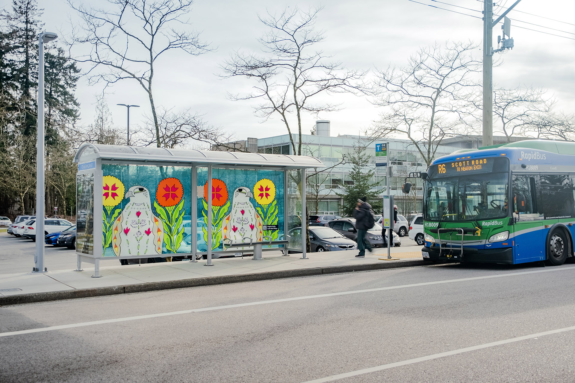 Jessie Sohpaul designed the bus shelter glazing for two bus stops — at the southbound median bus stop at 72 Avenue and Scott Road and the westbound KPU bus stop.