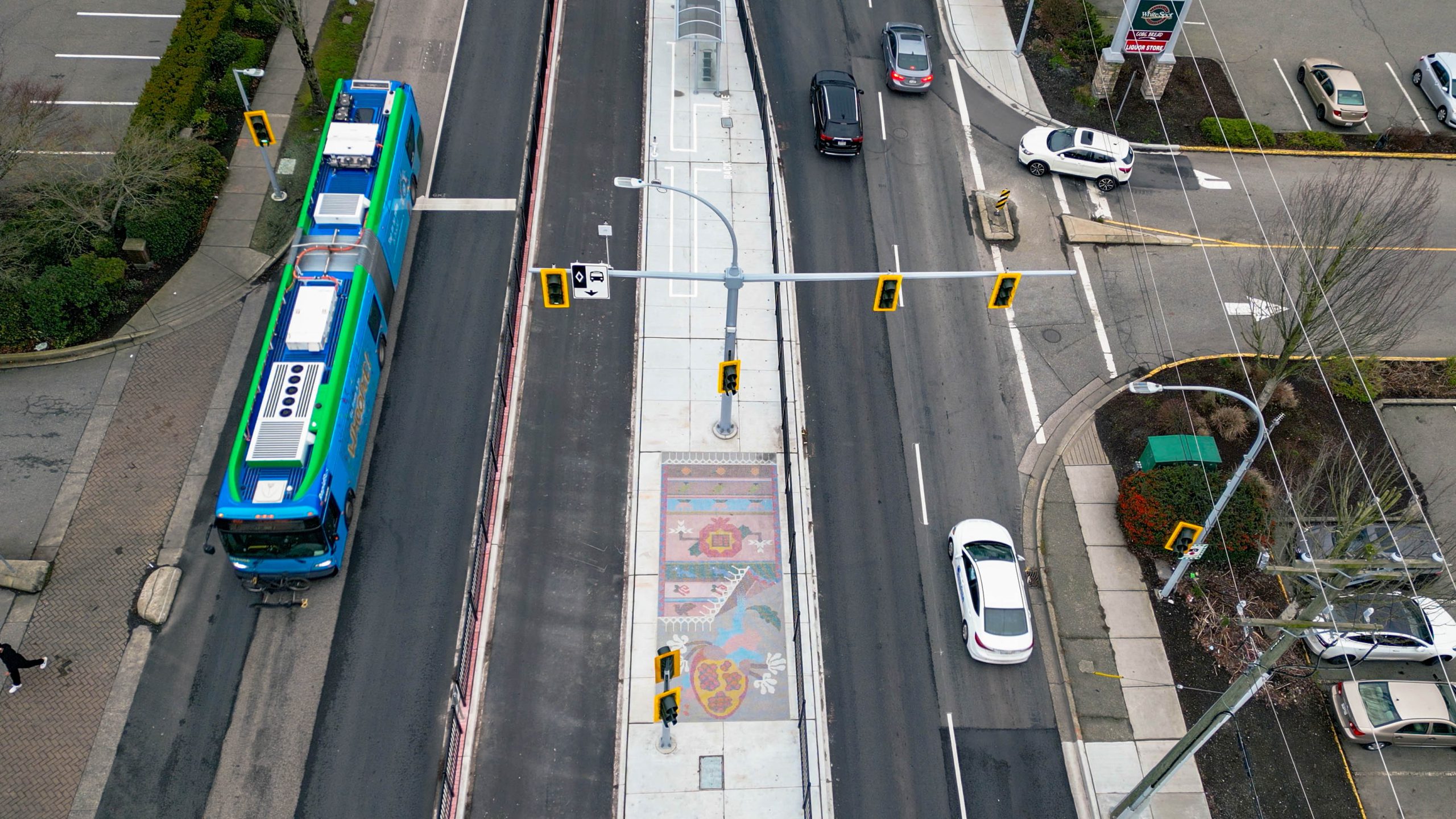 The R6 Scott Road RapidBus provides faster bus service for Surrey and Delta residents with features like a median centre-island bus boarding area, bus priority lanes, and sheltered bus stops.