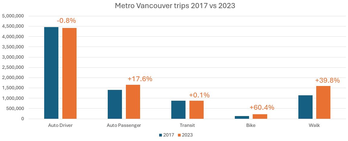 We surveyed 56,000 people across the region and used that information to estimate travel patterns for an average day in the fall of 2023. The survey found that compared to 2017 (the last time we did a Trip Diary), Metro Vancouver saw 37,000 fewer driving trips, and 535,000 more walking or cycling trips on an average weekday.