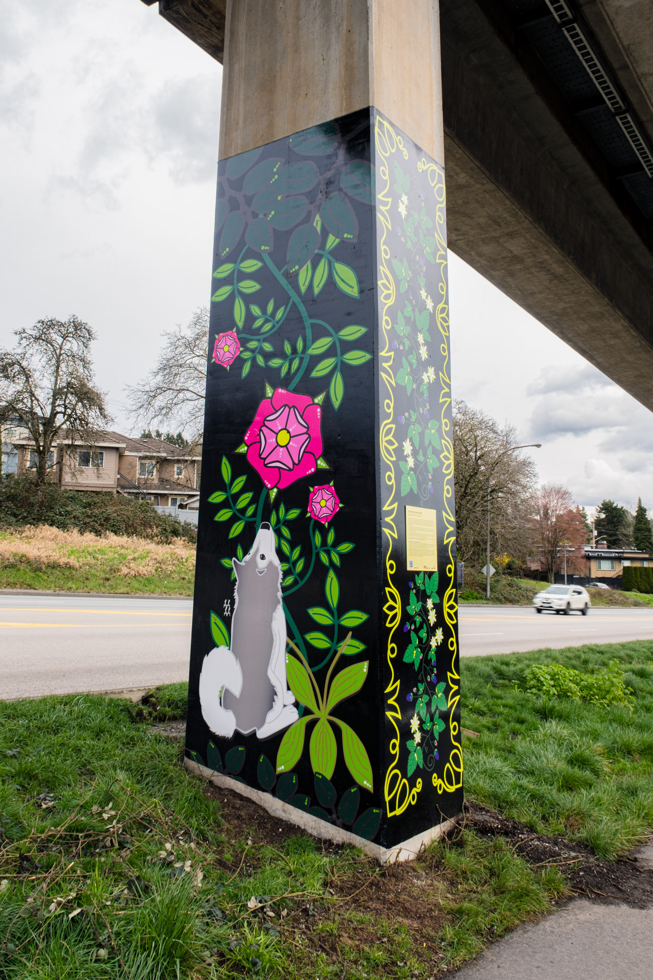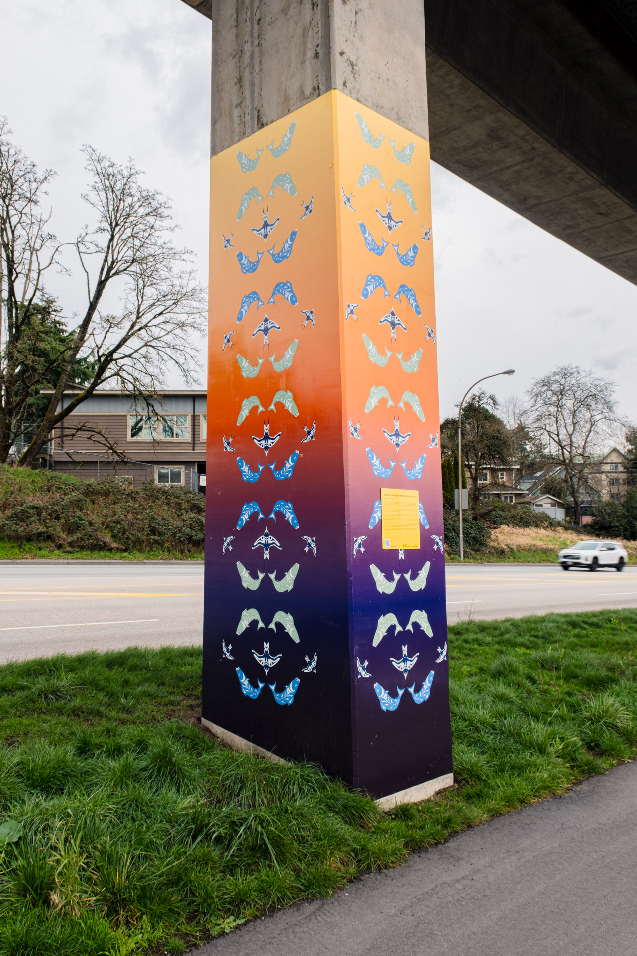 If you travel between 22nd Street and New Westminster SkyTrain stations on Expo Line, you’re traveling beside the newest public art installation on transit. Seven indigenous artists from diverse Nations have designed the vibrant artwork that grace SkyTrain guideway pillars along Stewardson Way in New Westminster.
